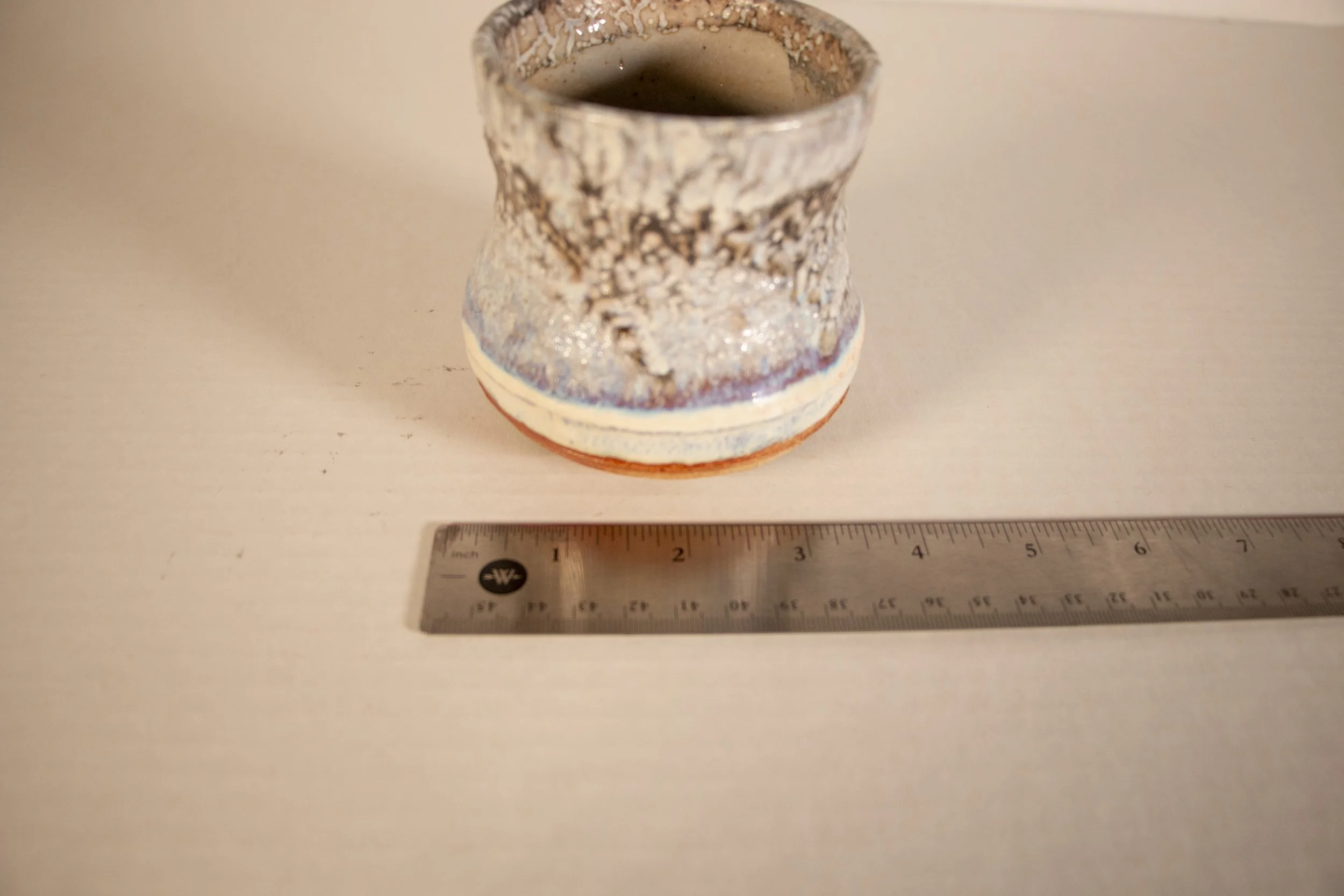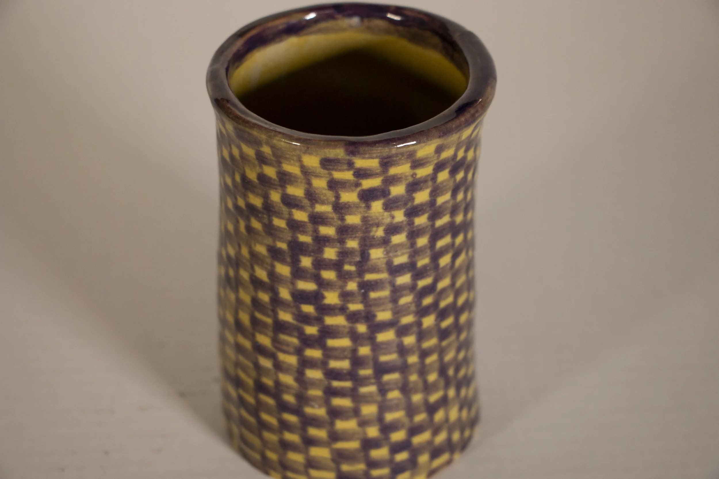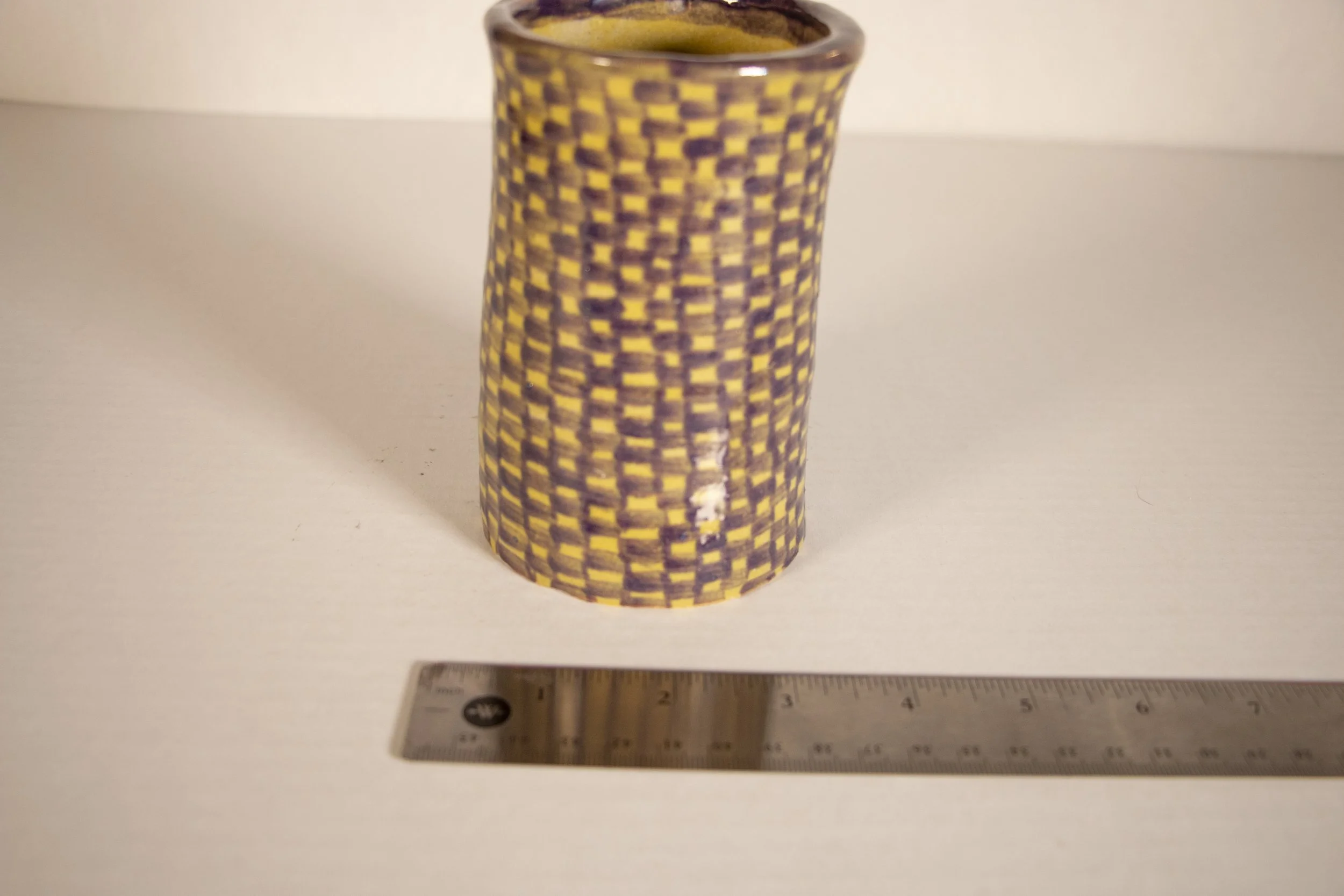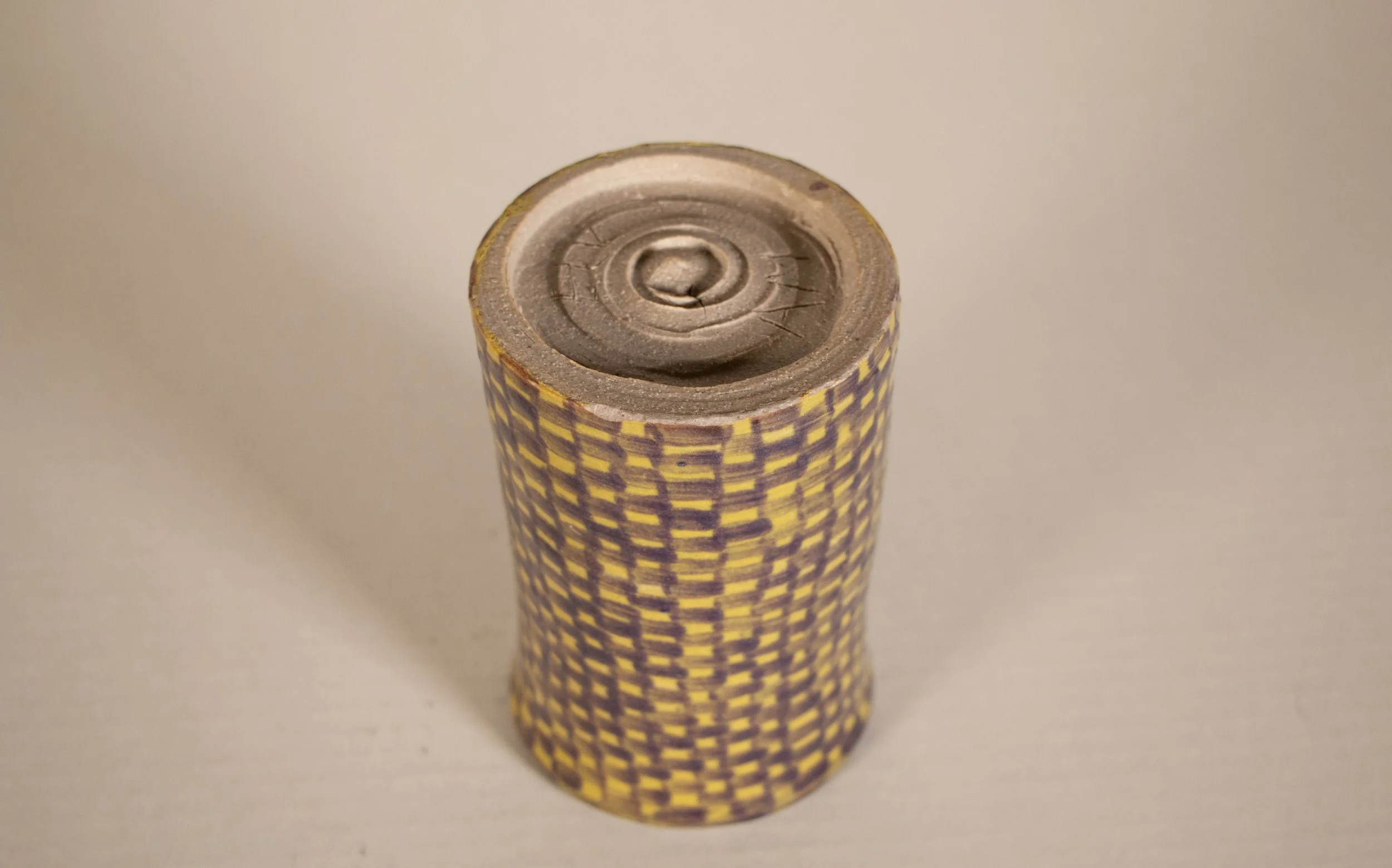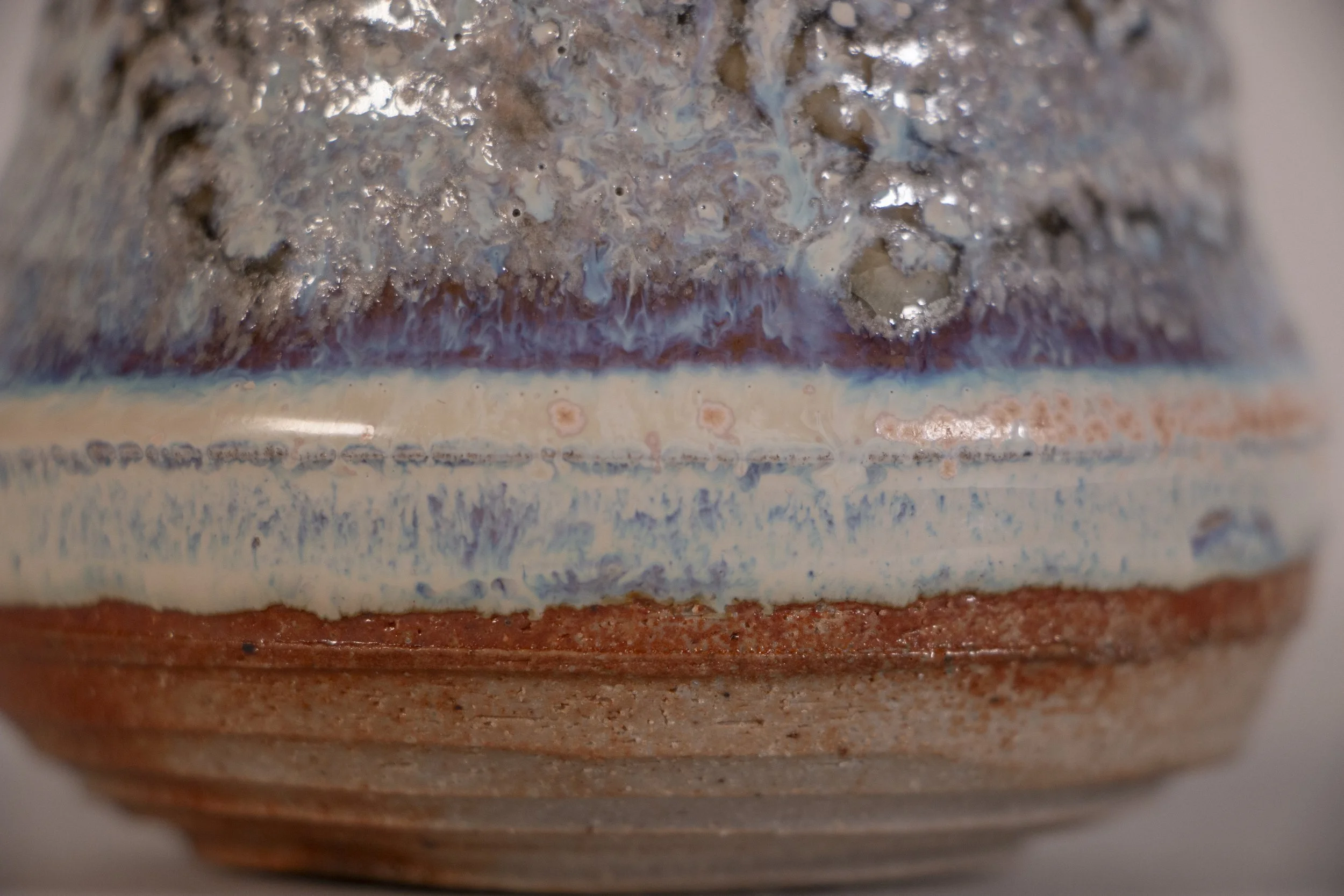 This vase was made through a technique of adding Maison stain (black and red) to the clay and cutting and layering small slabs into one slab then throwing the piece and cutting the most outer layer off of the piece revealing these psychedelic patterns. It is truly one of a kind.