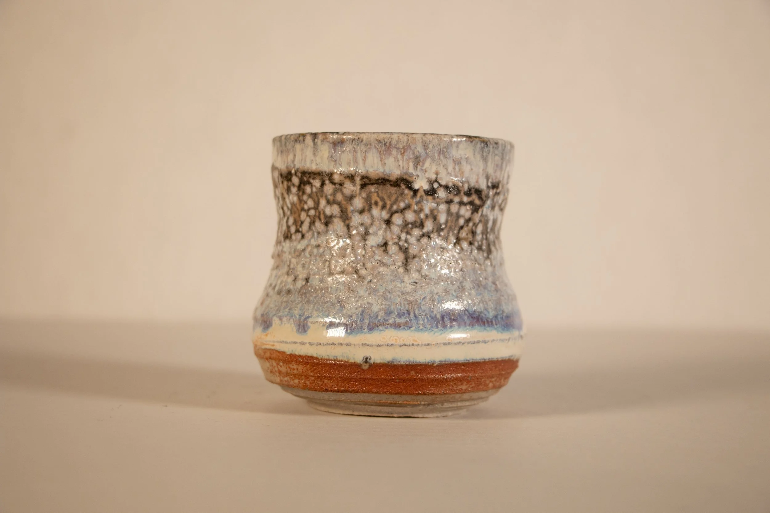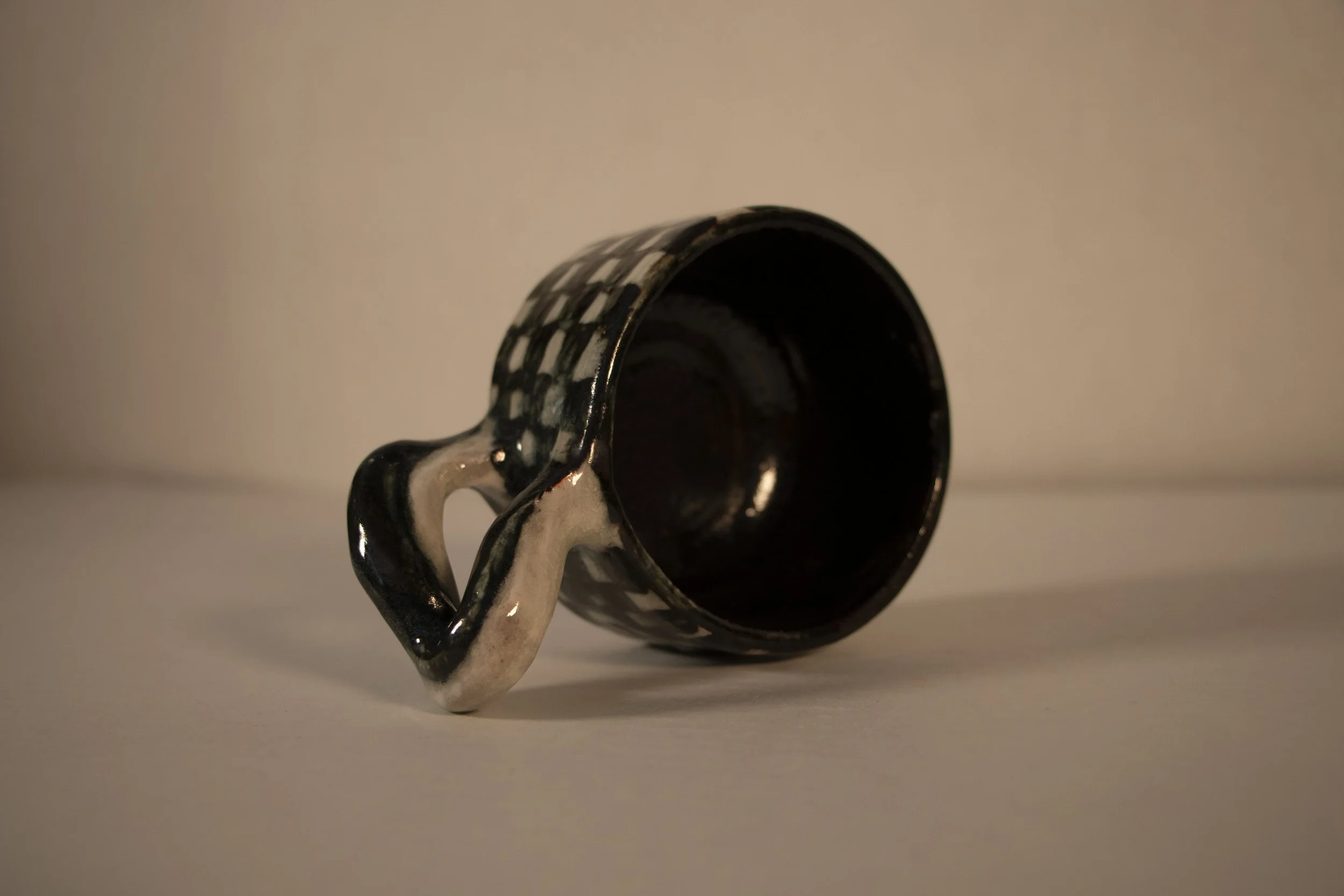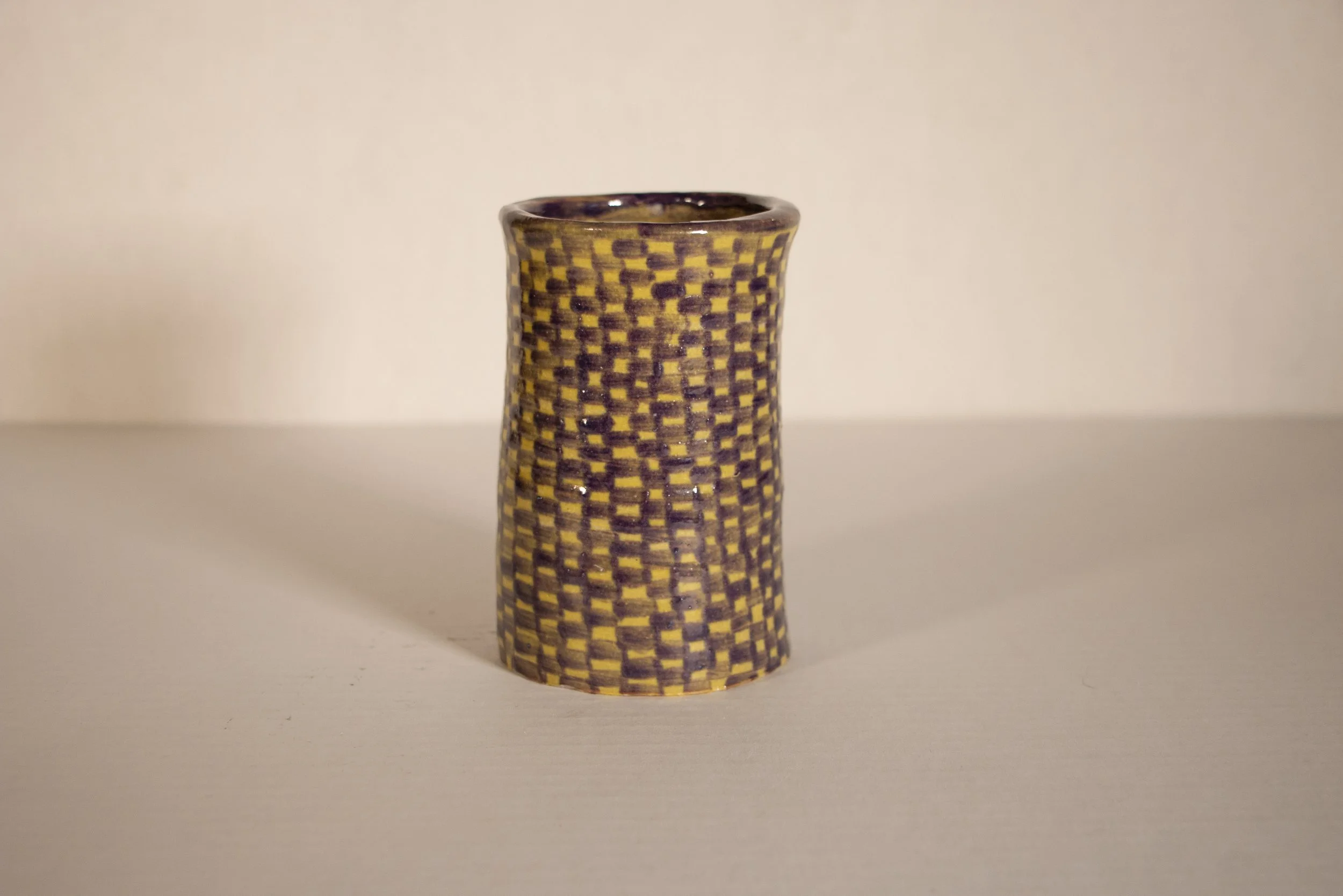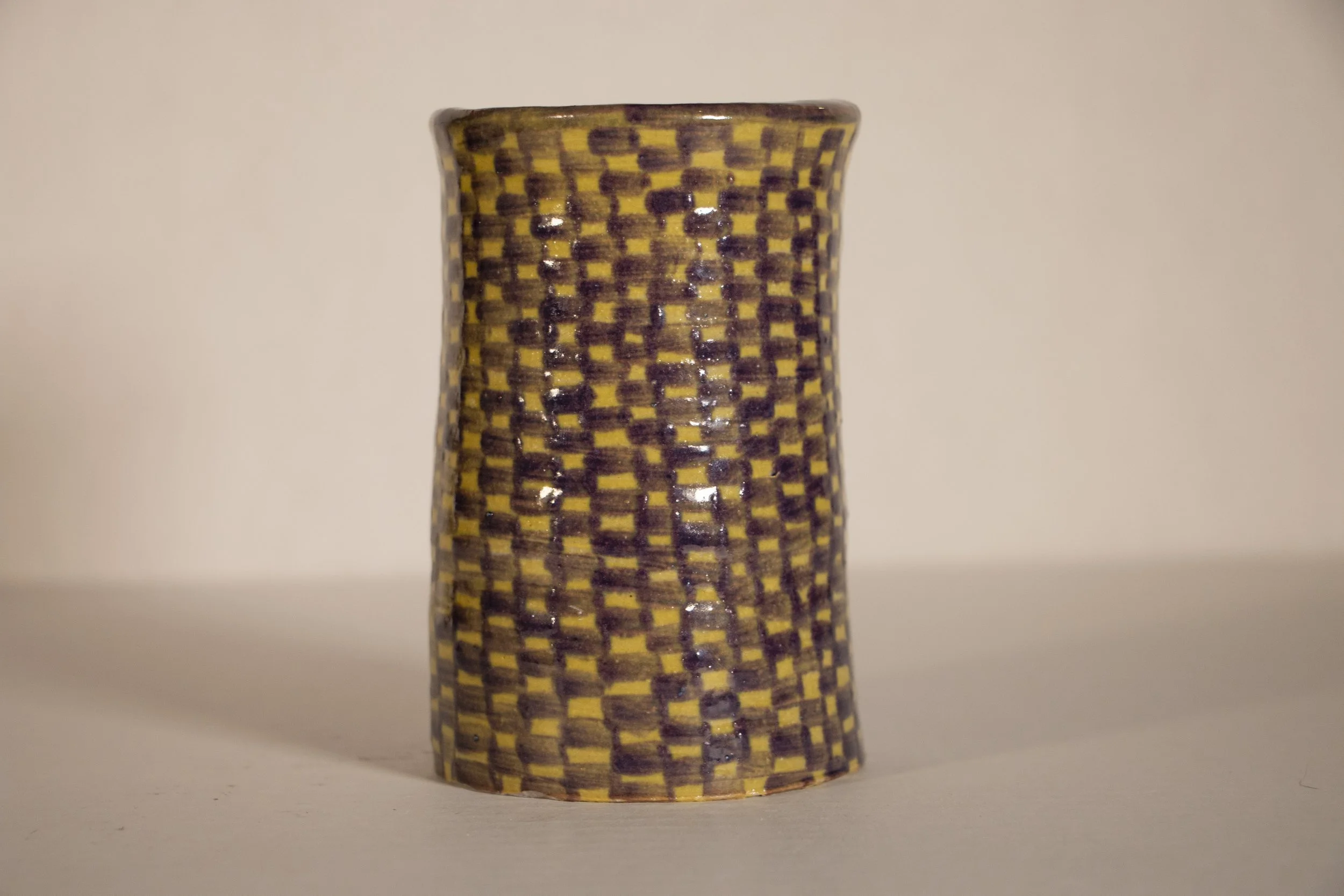 This vase was made through a technique of adding Maison stain (black and red) to the clay and cutting and layering small slabs into one slab then throwing the piece and cutting the most outer layer off of the piece revealing these psychedelic patterns. It is truly one of a kind.