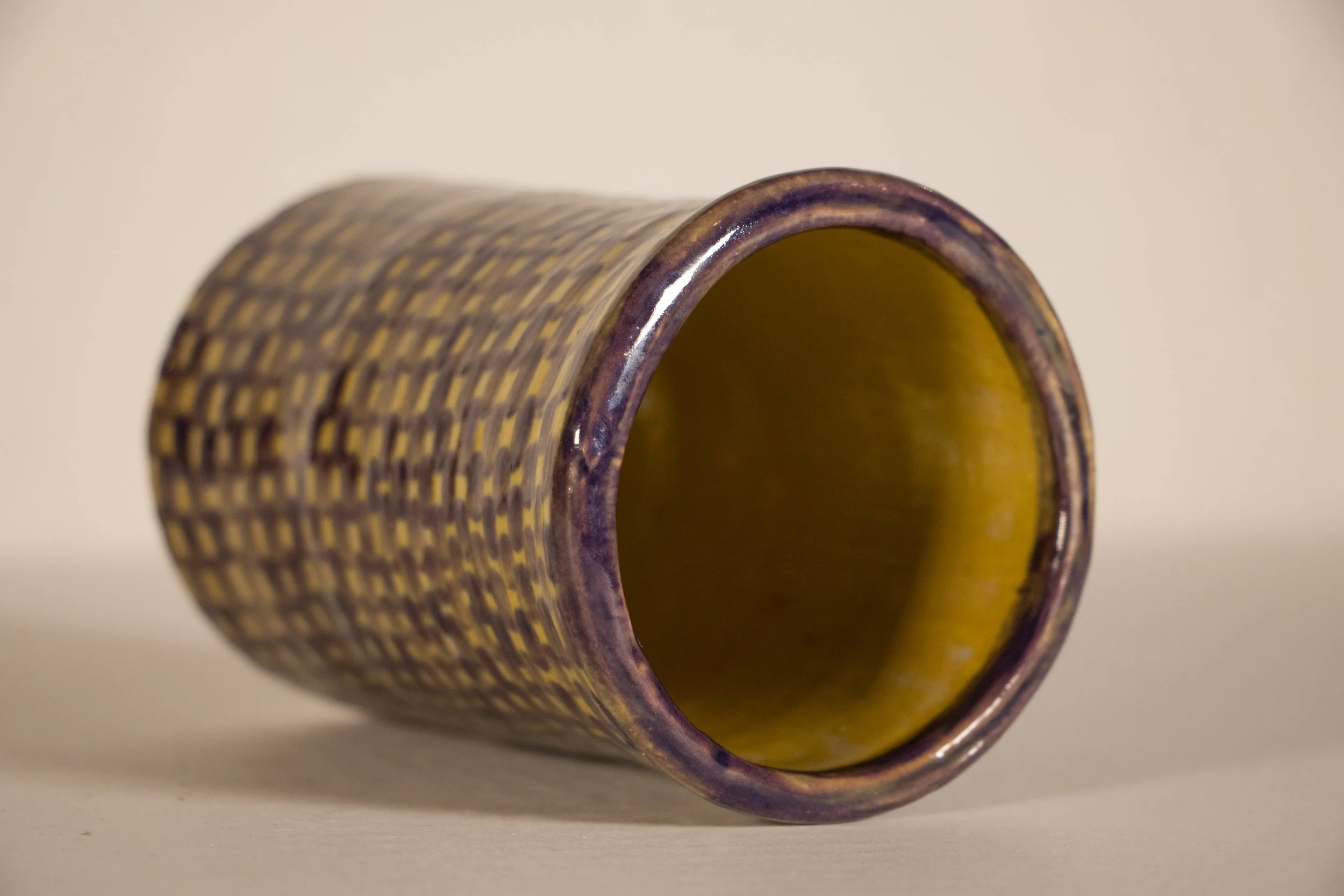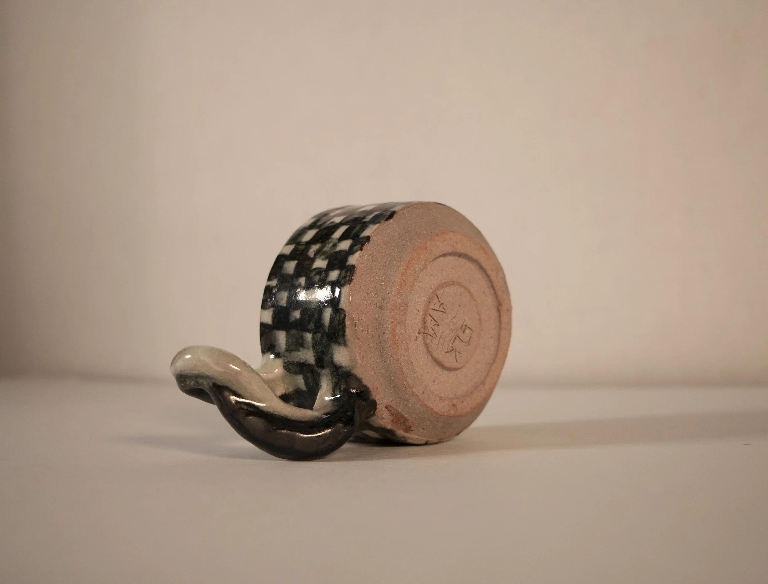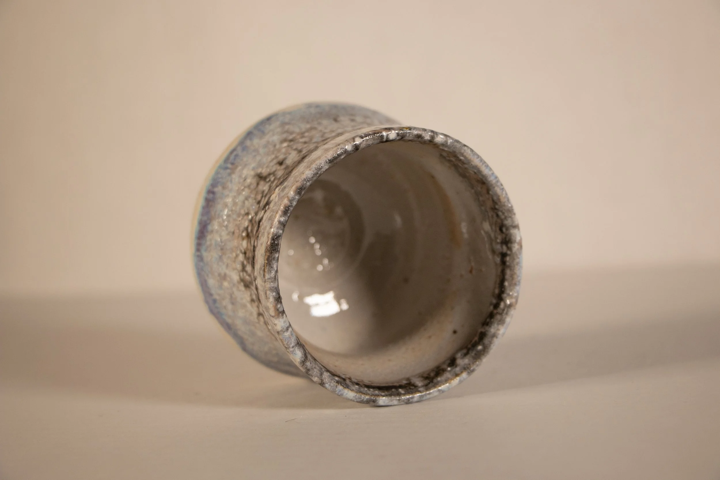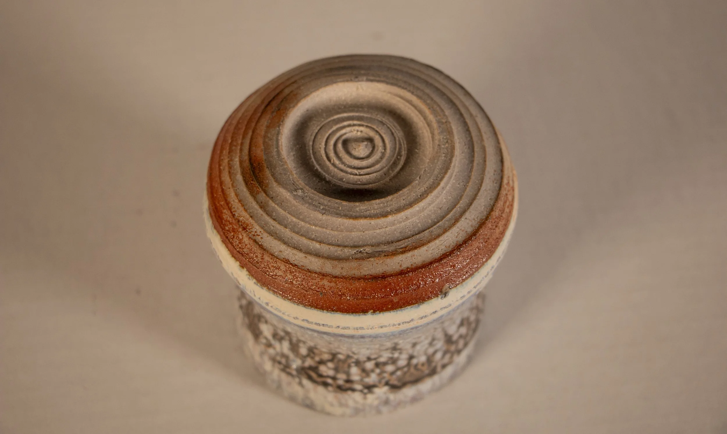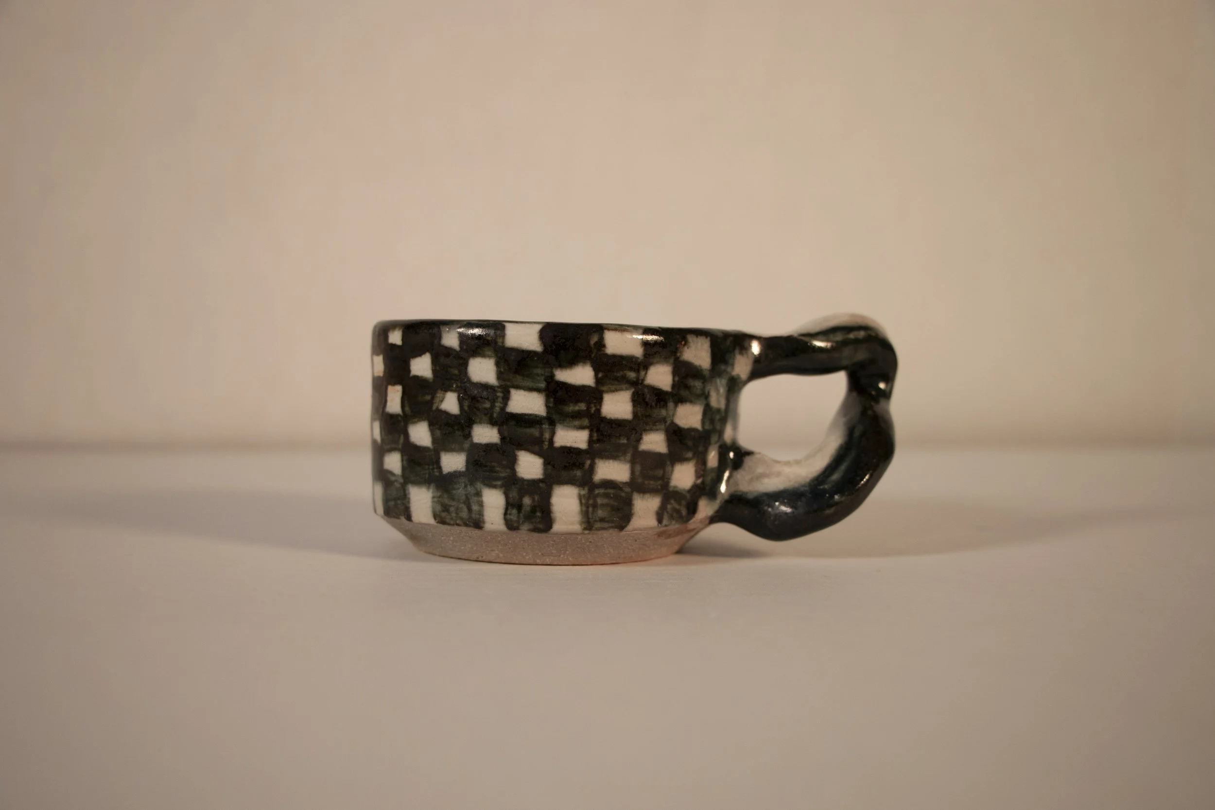 This vase was made through a technique of adding Maison stain (black and red) to the clay and cutting and layering small slabs into one slab then throwing the piece and cutting the most outer layer off of the piece revealing these psychedelic patterns. It is truly one of a kind.