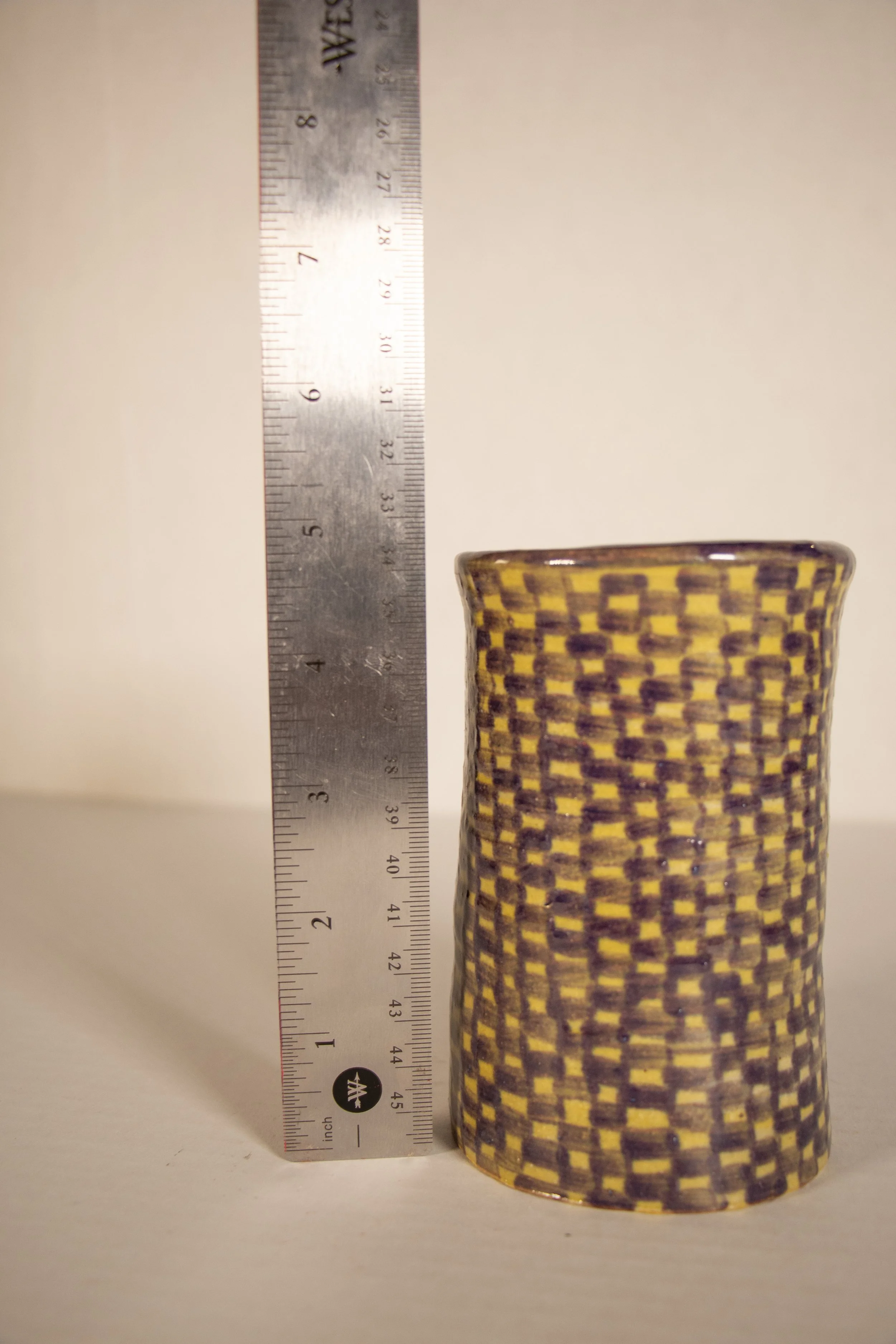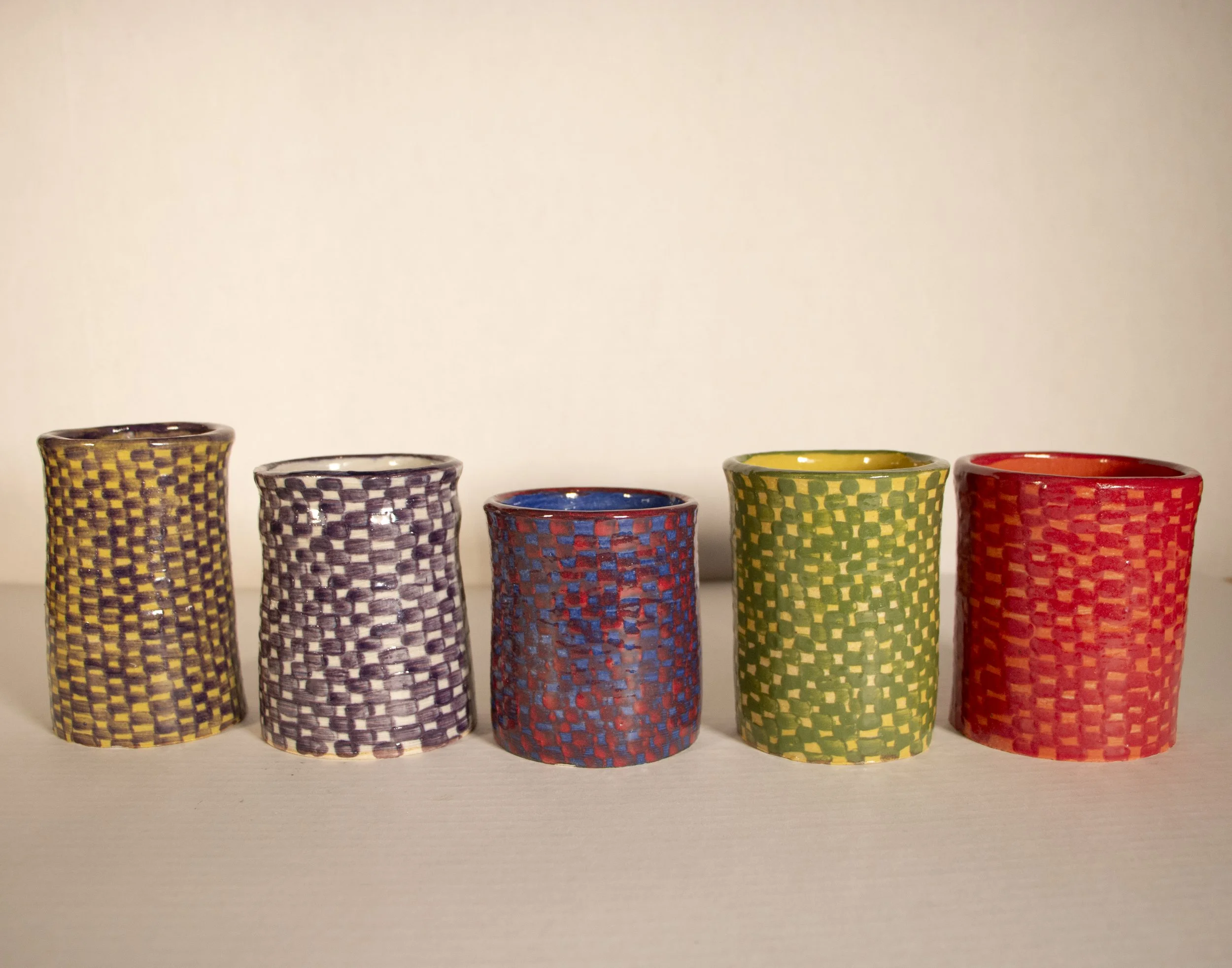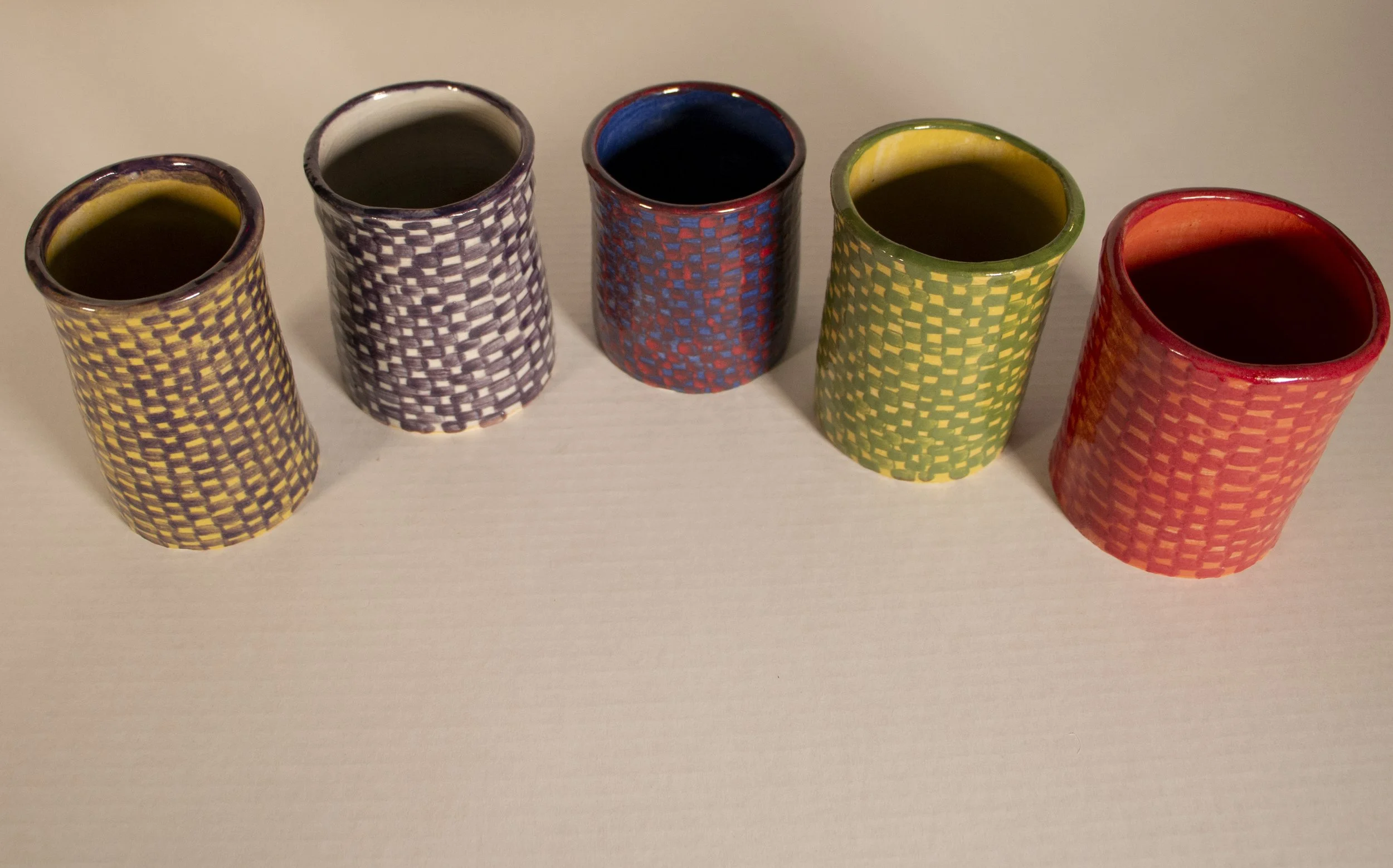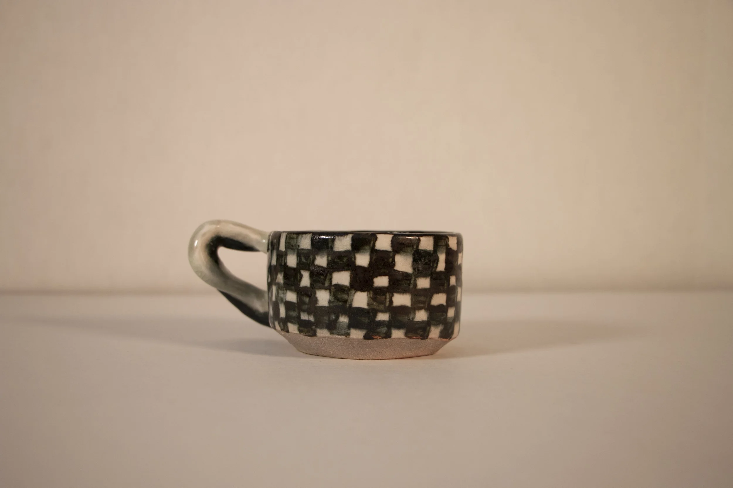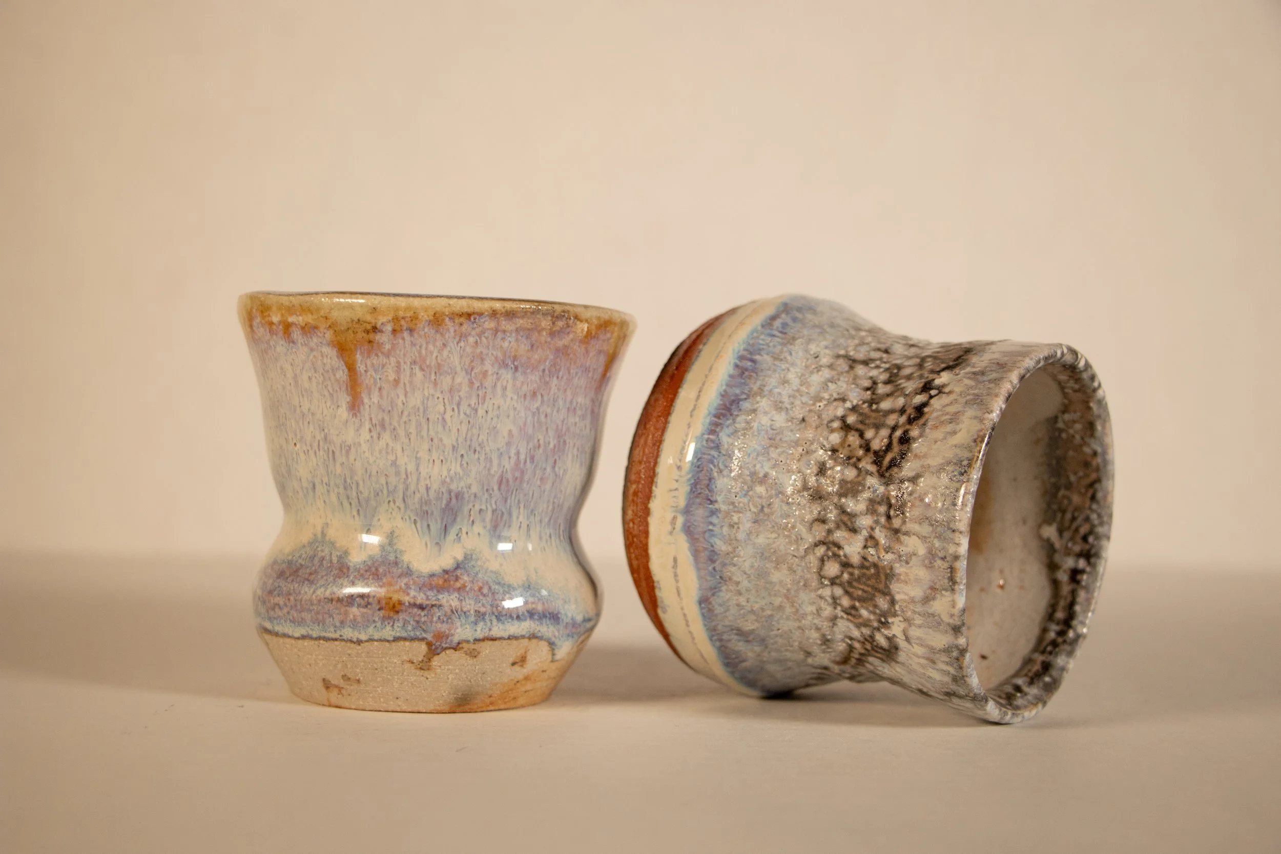 This vase was made through a technique of adding Maison stain (black and red) to the clay and cutting and layering small slabs into one slab then throwing the piece and cutting the most outer layer off of the piece revealing these psychedelic patterns. It is truly one of a kind.