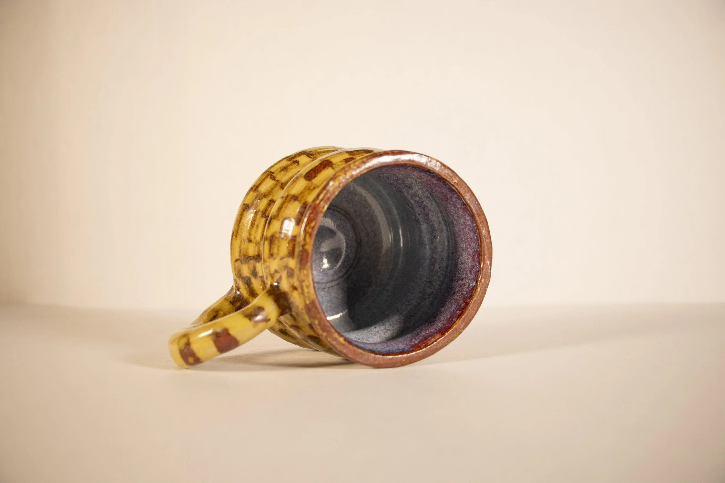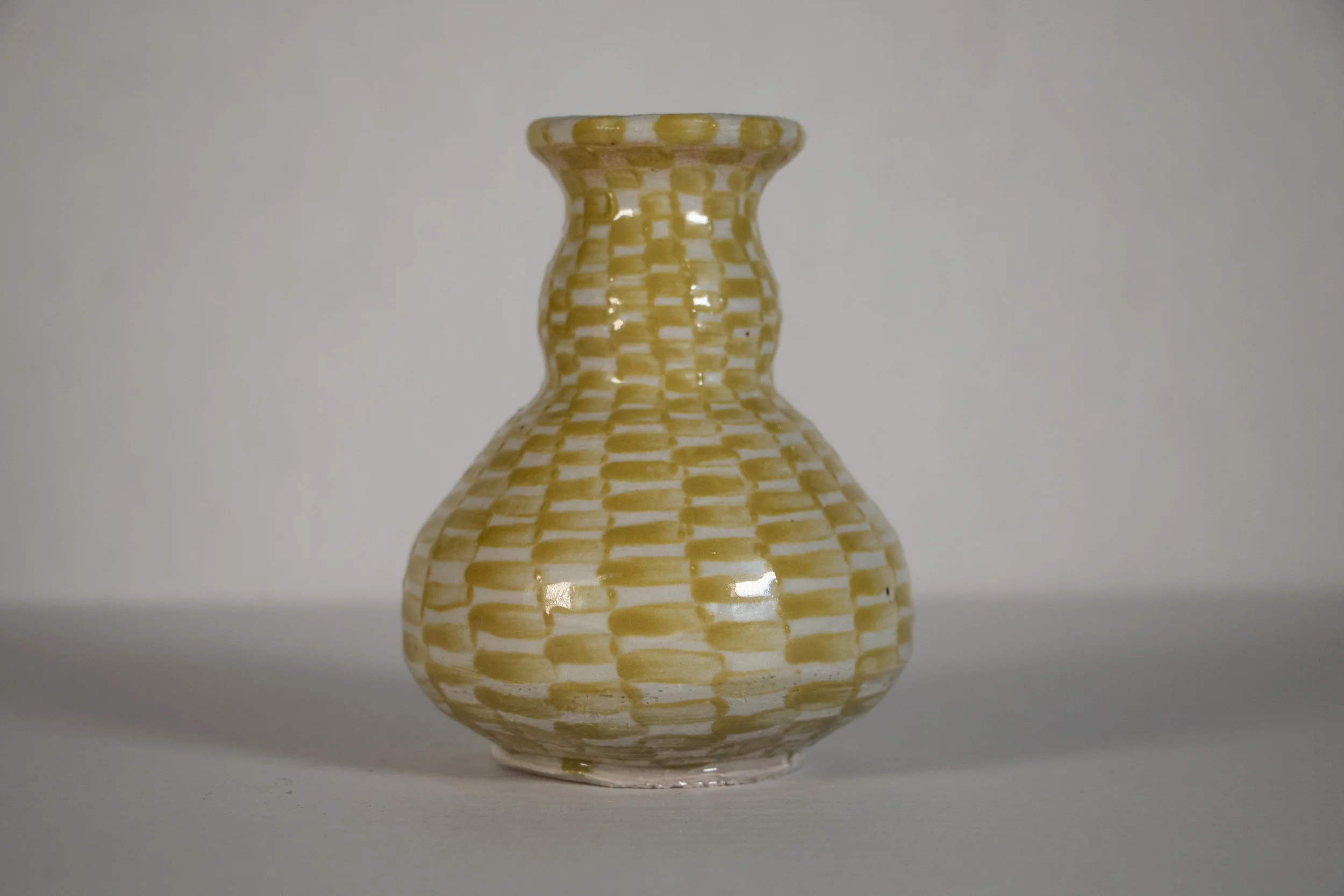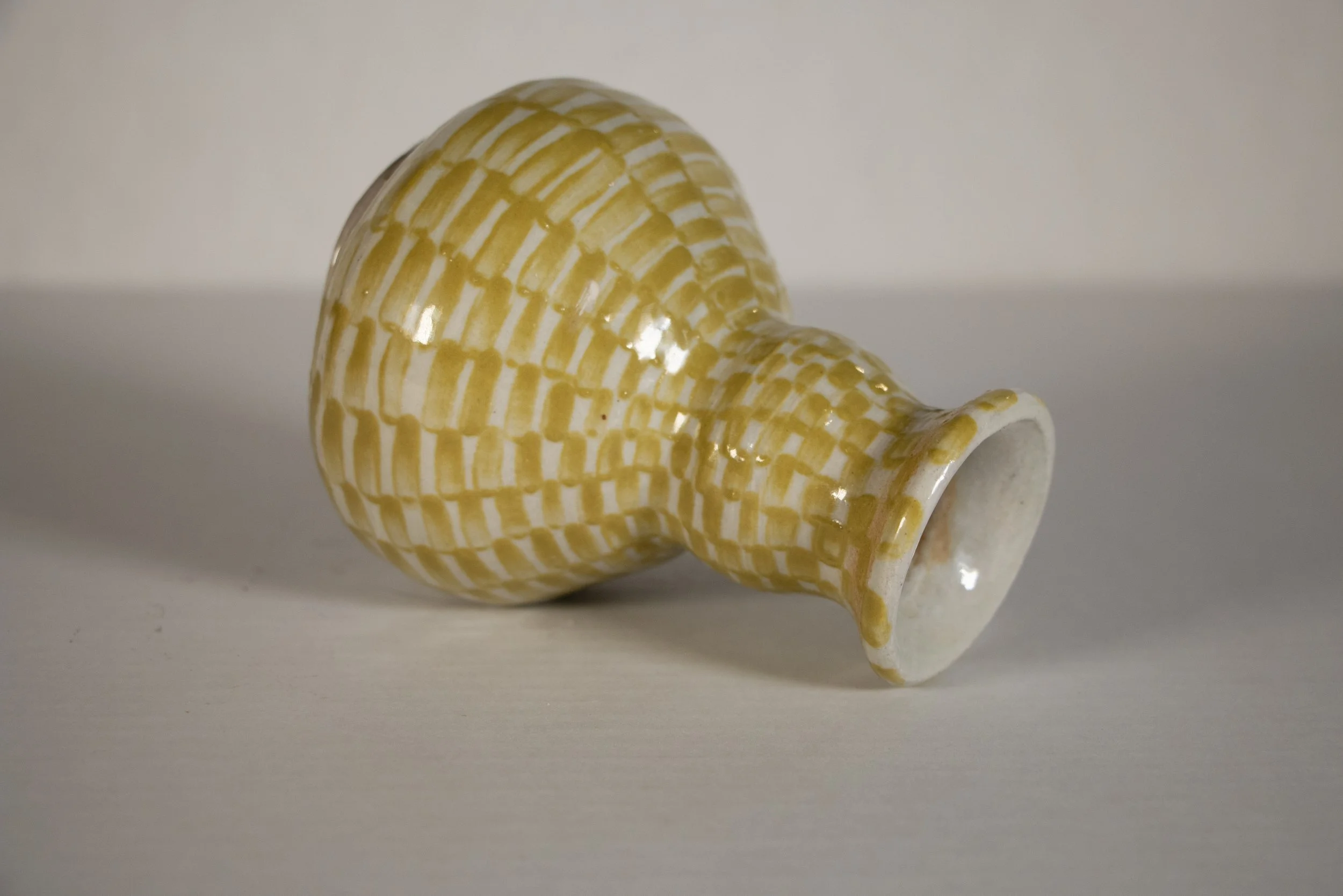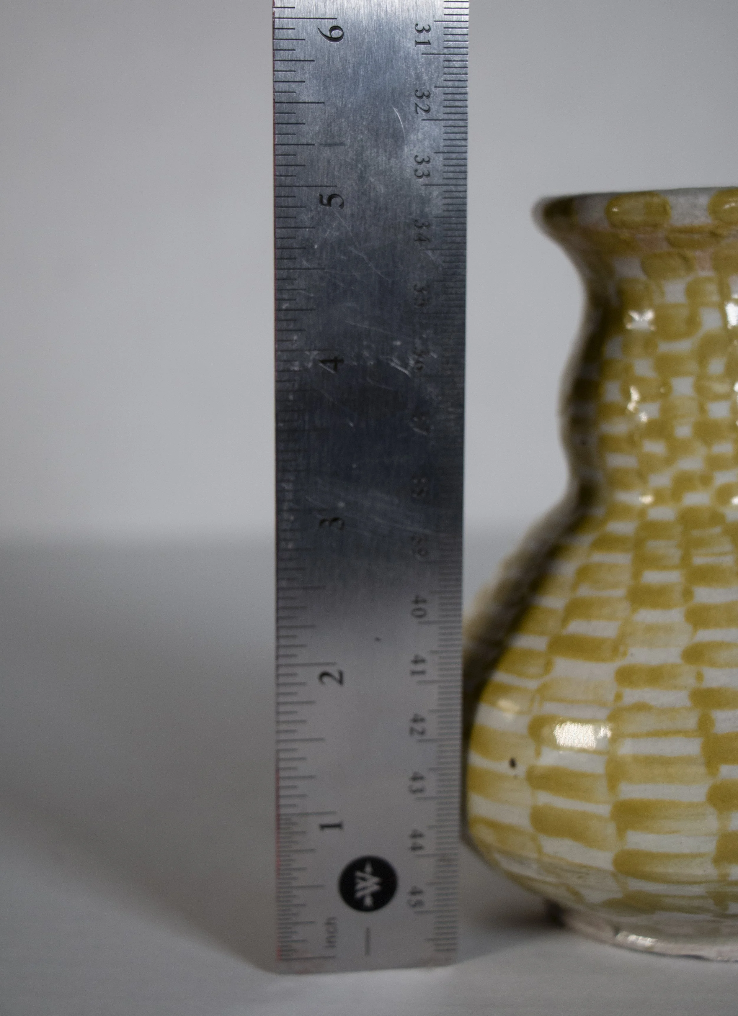 This vase was thrown on the wheel and then fired using the Raku method giving it it’s super shiny exterior!